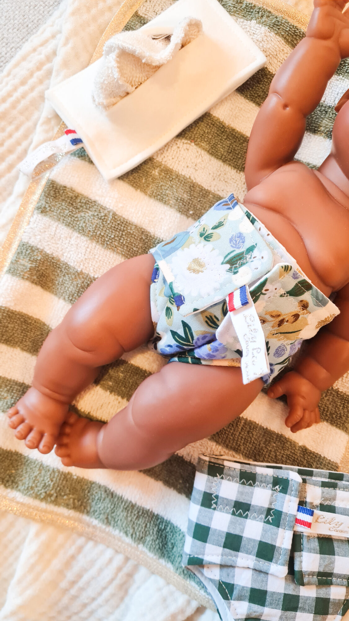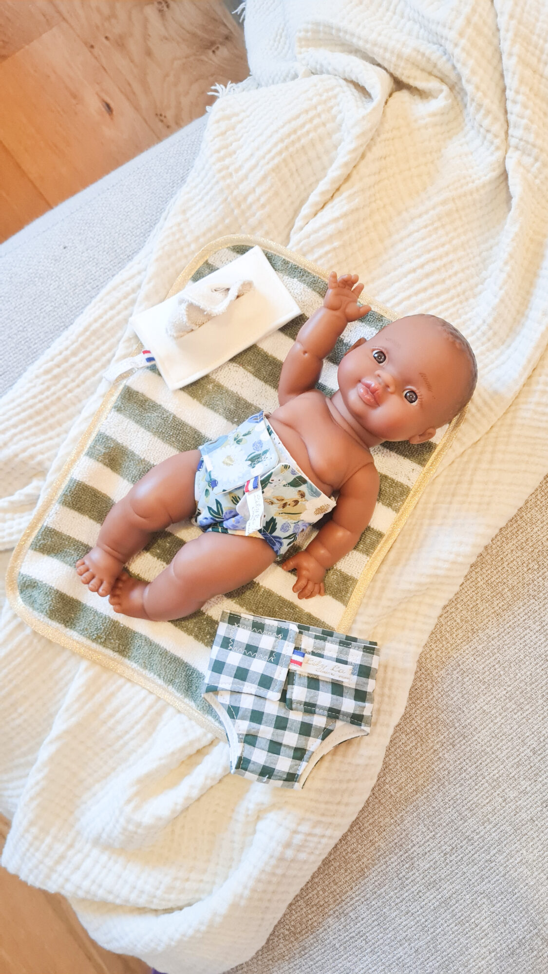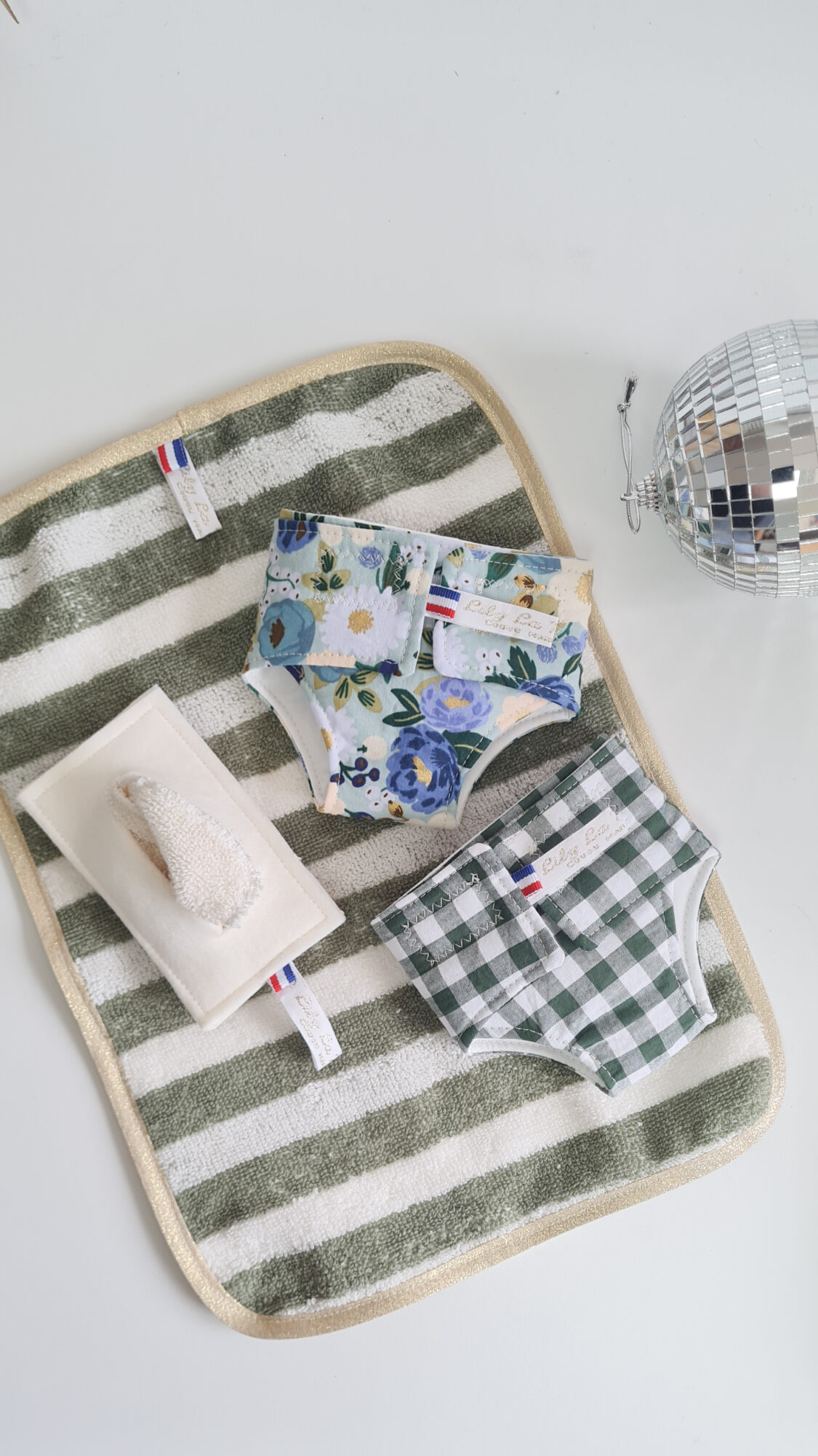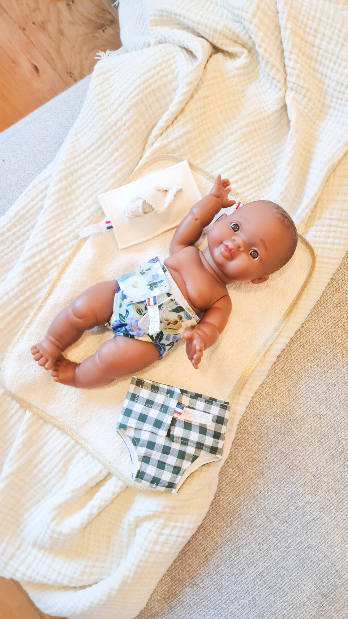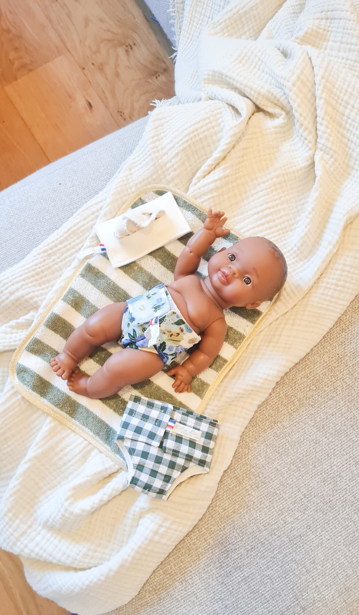 • Une serviette / tapis de change en coton bio pour poser la poupée