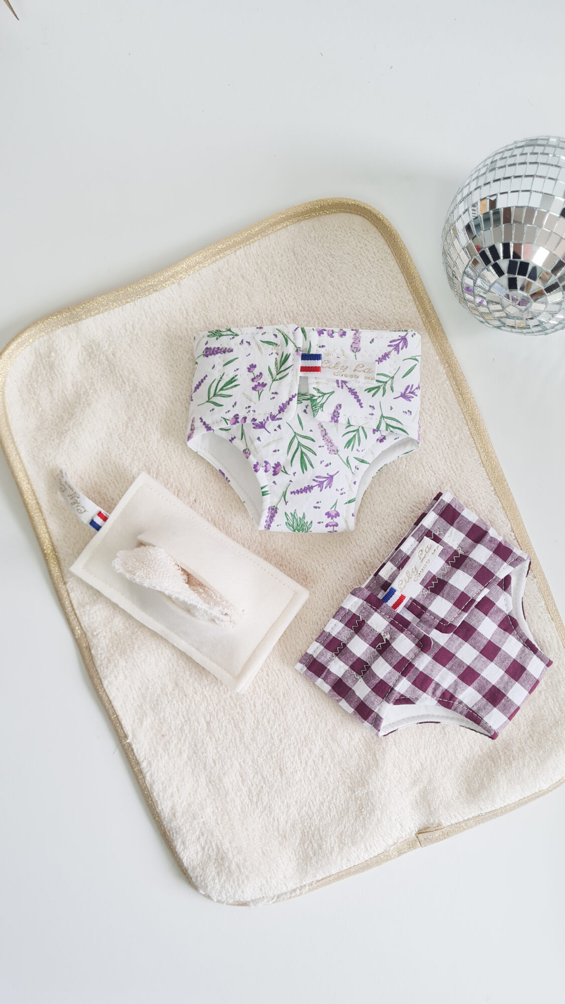- Une serviette / tapis de change en éponge cœur pour poser la poupée